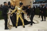 Sejumlah petugas membantu merapikan pakaian yang dikenakan Rapper Lil Nas X setibanya di acara Met Gala 2021, di Metropolitan Museum of Art in New York City, New York, Amerika Serikat, Senin (13/9/2021). Perhelatan offline terakhir digelar pada Senin pertama Mei 2019 lalu, setelah itu, acara ini tak lagi digelar karena pandemi COVID-19. ANTARA FOTO/Reuters-Mario Anzuoni/hp.