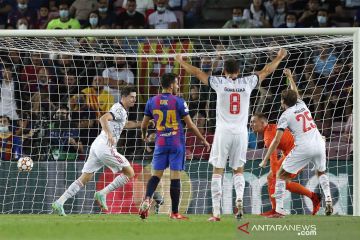 Pemain Bayern Munich Robert Lewandowski merayakan gol ke gawang Barcelona pada pertandingan fase grup Liga Champions di Camp Nou, Barcelona, Spanyol, Rabu (15/9/2021). Blaugrana tumbang dengan skor 0-3 di kandang. ANTARA FOTO/REUTERS/Albert Gea/rwa.