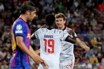 Pemain Bayern Munich Thomas Muller merayakan gol bersama Alphonso Davies saat menghadapi Barcelona pada pertandingan fase grup Liga Champions di Camp Nou, Barcelona, Spanyol, Rabu (15/9/2021). Blaugrana tumbang dengan skor 0-3 di kandang. ANTARA FOTO/REUTERS/Albert Gea/rwa.