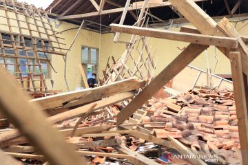 Warga melihat reruntuhan bangunan laboratorium biologi yang ambruk di SMAN 1 Lelea, Indramayu, Jawa Barat, Rabu (15/9/2021). Dua ruangan laboratorium dan satu ruangan perpustakaan di sekolah itu ambruk akibat tidak kuat menahan guyuran hujan deras dan angin kencang. ANTARA FOTO/Dedhez Anggara/rwa.