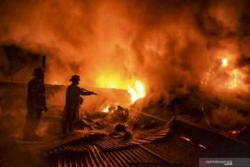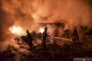 Petugas pemadam kebakaran berusaha memadamkan api yang membakar pabrik pembuatan kursi rotan di Jalan Setia Budi Medan, Sumatera Utara, Sabtu (25/9/2021) malam. Kebakaran yang terjadi pada pukul 22.51 WIB tersebut menghanguskan pabrik pembuatan kursi rotan serta dua rumah semi permanen dan penyebab kebakaran masih dalam penyelidikan pihak terkait. ANTARA FOTO/Fransisco Carolio/Lmo/hp.