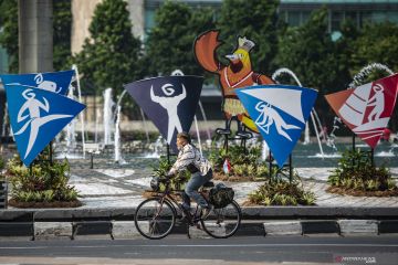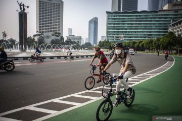 Pesepeda berbaju batik melintas di kawasan Bundaran HI, Jakarta, Sabtu (2/10/2021). Kegiatan berbaju batik saat bersepeda itu sebagai bentuk perayaan memperingati Hari Batik Nasional setiap tanggal 2 Oktober. ANTARA FOTO/Aprillio Akbar/pras.