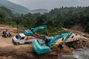Pekerja menggunakan alat berat untuk menyelesaikan perbaikan jalan di Lebak Gedong, Lebak, Banten, Sabtu (2/10/2021). Pemprov Banten melakukan perbaikan jalan nasional penghubung antar provinsi sepanjang 9 kilometer serta 5 jembatan di Lebak yang sebelumnya rusak akibat longsor pada tahun lalu dan ditargetkan selesai pada akhir Desember 2021. ANTARA FOTO/Muhammad Bagus Khoirunas/aww.
