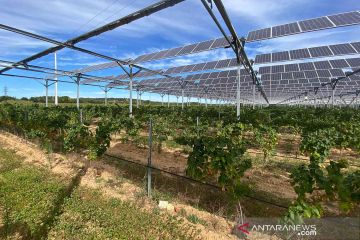 Panel surya terpasang di kebun anggur pembuat anggur Pierre Escudie di Tresserre, Prancis, Kamis (30/9/2021). ANTARA FOTO/REUTERS/Alexandre Minguez/rwa.