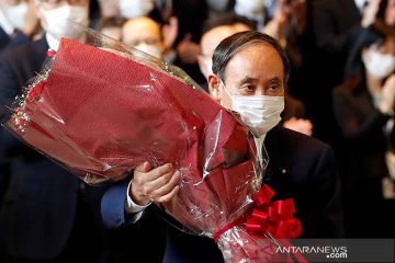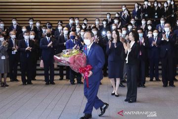 Perdana Menteri Jepang Yoshihide Suga membawa karangan bunga saat meninggalkan kantor perdana menteri di Tokyo, Jepang, Senin (4/10/2021). Fumio Kishida, pemimpin Partai Demokrat Liberal yang berkuasa, akan menjabat sebagai perdana menteri baru. ANTARA FOTO/REUTERS/Issei Kato/rwa.