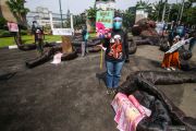 Aktivis melakukan aksi di depan Gedung DPR, Senayan, Jakarta, Selasa (5/10/2021). Aksi dengan membawa replika monster gurita raksasa ini untuk memperingati satu tahun pengesahan UU Cipta Kerja. ANTARA FOTO/Rivan Awal Lingga/foc.