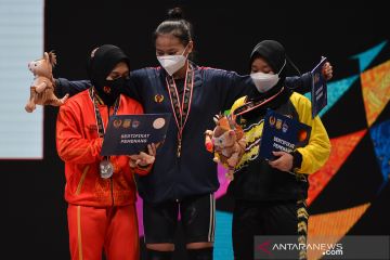 Lifter putri Jawa Barat Windy Cantika mengangkat beban pada kelas 49 kg PON Papua di Auditorium Universitas Cenderawasih, Kota Jayapura, Papua, Rabu (6/10/2021).Lifter putri Jawa Barat Windy Cantika berhasil meraih medali emas dengan total angkatan 192 kg sementara medali perak diraih lifter Jawa Tengah Siti Nafisatul dengan total angkatan 170 kg dan medali perunggu diraih lifter Kalimantan Selatan Riska Nur Amanda dengan 167 kg. ANTARA FOTO/Fauzan/pras.