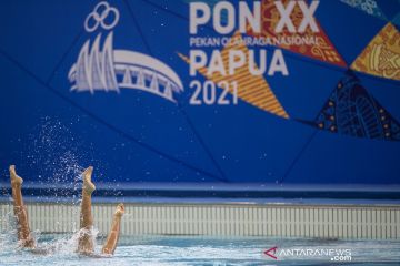 Atlet renang artistik putri Jawa Barat Maharani Sekar Langit (kanan) dan Petra S Puspa Melati (kiri) menari saat mengikuti pertandingan renang artistik nomor Duet Technical PON Papua di Stadion Akuatik, Kampung Harapan, Kabupaten Jayapura, Papua, Rabu (6/10/2021). ANTARA FOTO/M Agung Rajasa/pras.