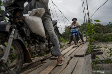 Sejumlah buruh tani mengendarai sepeda motor melewati jembatan gantung yang rusak di Desa Salua, Kulawi, Sigi, Sulawesi Tengah, Senin (11/10/2021). Warga setempat mengeluhkan tidak kunjung diperbaikinya jembatan gantung tersebut sejak rusak tiga tahun lalu akibat bencana banjir karena menjadi satu-satunya akses dari dan menuju beberapa desa dan menjadi jalur untuk mengangkut hasil produksi pertanian warga setempat. ANTARA FOTO/Basri Marzuki/foc.