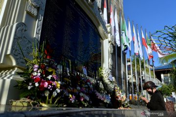 Warga menaburkan bunga saat peringatan 19 tahun tragedi bom Bali di Monumen Bom Bali, Badung, Bali, Selasa (12/10/2021). Peringatan tragedi terorisme yang menewaskan 202 orang tersebut dilakukan dengan doa bersama, tabur bunga dan penyalaan lilin oleh warga, keluarga serta kerabat korban. ANTARA FOTO/Fikri Yusuf/hp.