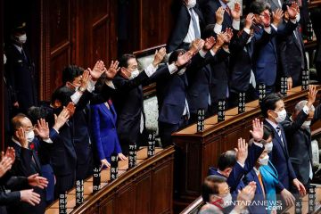 Anggota parlemen Jepang mengangkat tangannya dan menyerukan "banzai" (tepuk tangan) setelah pembubaran majelis rendah diumumkan di Parlemen di Tokyo, Jepang, Kamis (14/10/2021). ANTARA FOTO/Kyodo/via REUTERS/rwa.