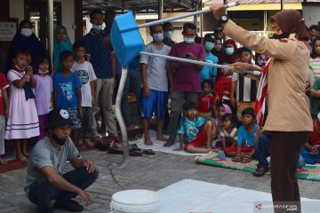 Warga memperagakan cara menangkap ular dengan bimbingan dan pengawasan Sahabat Reptil Bekasi di Perumahan Panjibuwono, Babelan, Kabupaten Bekasi, Jawa Barat, Sabtu (16/10/2021). Kegiatan tersebut bertujuan mengedukasi warga dan anak-anak untuk mengenal berbagai jenis ular dan bagaimana cara memberikan pertolongan pertama ketika digigit ular serta cara yang aman menangkapnya. ANTARA FOTO/Suwandy/pras.