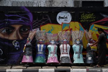 Rijal merapikan kerajinan ondel-ondel ukuran anak-anak yang ia jual di Pasar Minggu, Jakarta, Jumat (22/10/2021). Menteri Keuangan Sri Mulyani Indrawati menyebutkan anggaran pemulihan ekonomi nasional (PEN) telah terealisasi sebesar Rp428,21 triliun atau 57,5 persen dari pagu Rp744,77 triliun per 15 Oktober 2021. ANTARA FOTO/Sigid Kurniawan/wsj.