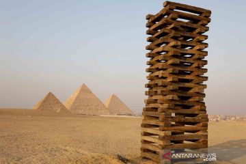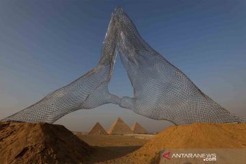 Patung 'Body That Rises' karya seniman Brasil Joao Trevisan terlihat di depan Piramida Agung Giza, pinggiran Kairo, Mesir, Sabtu (23/10/2021). ANTARA FOTO/REUTERS/Mohamed Abd El Ghany/rwa.