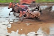 Joki memacu dua sapinya saat latihan pacu jawi di Nagari Gurun, Sungai Tarab, Tanah Datar, Sumatera Barat, Sabtu (23/10/2021). Latihan saat pandemi COVID-19 tersebut dilakukan untuk menjaga kebugaran sapi dan ketangkasan joki. ANTARA FOTO/Wahdi Septiawan/hp.