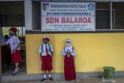 Sejumlah murid penyintas bencana likuifaksi bersiap mengikuti Pembelajaran Tatap Muka (PTM) perdana di sekolah darurat bencana SDN Balaroa, Palu, Sulawesi Tengah, Senin (18/10). Setelah belajar secara daring akibat pandemi COVID-19 selama hampir dua tahun, sekolah darurat yang berada di kawasan Hunian Tetap (Huntap) Balaroa itu kembali melakukan kegiatan belajar secara langsung dengan menerapkan protokol kesehatan yang ketat. ANTARA FOTO/Basri Marzuki/hp.