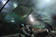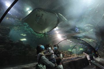 Orang tua mendampingi anaknya ke SeaWorld Ancol, Jakarta, Jumat (22/10/2021). SeaWorld kini mengizinkan anak usia di bawah 12 tahun memasuki tempat wisata dengan pendampingan orang tua seiring penurunan status PPKM Jakarta menjadi level 2. ANTARA FOTO/ Reno Esnir/fhp.