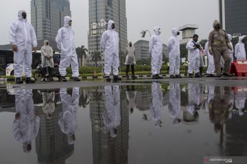 Petugas kepolisian mengenakan APD saat berjaga di aksi unjuk rasa Aliansi Badan Eksekutif Mahasiswa Seluruh Indonesia (BEM SI) di kawasan Bundaran Patung Kuda, Jakarta, Kamis (21/10/2021). Unjuk rasa yang diikuti mahasiswa dari puluhan kampus tersebut untuk memperingati dua tahun pemerintahan Joko Widodo-MaÕruf Amin. ANTARA FOTO/Wahyu Putro A/hp.