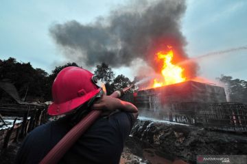 Petugas memadamkan api yang membakar tempat penyulingan minyak mentah ilegal di Jambi Luar Kota, Muarojambi, Jambi, Senin (18/10/2021). Aparat Kepolisian Sektor Jambi Luar Kota yang turut dalam upaya pemadaman bersama petugas Satpol PP dan Pemadam Kebakaran Kabupaten Muarojambi masih menyelidiki penyebab kebakaran. ANTARA FOTO/Wahdi Septiawan/hp.