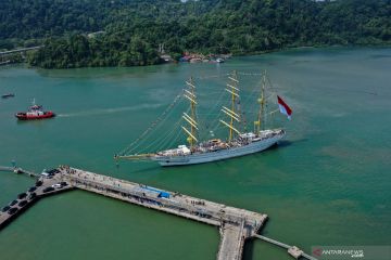 Foto udara KRI Bima Suci tiba di Pelabuhan Tanjung Intan Cilacap, Jawa Tengah, Kamis (21/10/2021). Satgas KJK 2021 KRI Bima Suci akan berada di Cilacap selama empat hari dalam rangka mendukung latihan praktek Taruna Akademi Angkatan Laut (AAL) Tingkat III Angkatan ke-68. ANTARA FOTO/Idhad Zakaria/hp.