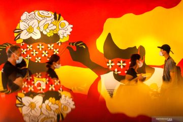 Pengunjung melintas di pameran Indonesian Contemporary Art & Design (ICAD) 2021 di Grand Kemang, Jakarta, Sabtu (23/10/2021). Pameran yang menghadirkan desain dan seni kontemporer ini berlangsung dari 21 Oktober hingga 28 November 2021 mendatang. ANTARA FOTO/Rivan Awal Lingga/hp.