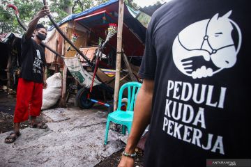 Kusir membersihkan kereta kuda di Pesanggrahan, Jakarta, Senin (18/10/2021). Suku Dinas Ketahanan Pangan, Kelautan dan Pertanian Jakarta Selatan, dan Suku Dinas Perhubungan Jakarta Selatan bekerjasama dengan Jakarta Animal Aid Network (JAAN) telah meluncurkan kartu tanda pemilik kuda serta kartu kusir kuda pekerja dengan tujuan untuk membantu meningkatkan kesejahteraan bagi kusir dan kuda pekerja. ANTARA FOTO/Rivan Awal Lingga/hp.