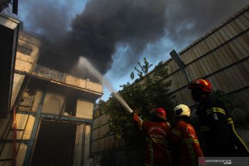 Petugas Dinas Pemadam Kebakaran Kota Surabaya memadamkan kebakaran pabrik manekin, di Jalan Kedung Cowek, Surabaya, Jawa Timur, Kamis (4/11/2021). Sebanyak 26 kendaraan pemadam kebakaran dikerahkan untuk memadamkan api yang membakar pabrik manekin itu. ANTARA FOTO/Didik Suhartono/foc.