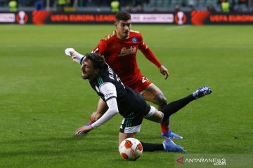 Pesepak bola Napoli Dries Mertens (tengah) melakukan selebrasi bersama rekan-rekannya setelah mencetak gol ke gawang Legia Warsawa dalam laga Group C Liga Europa, di Stadion Wojska Polskiego, Warsawa, Polandia, Kamis (4/11/2021). Napoli berhasil megalahakanLegia Warsawa 4-1. ANTARA FOTO/Reuters-Kacper Pempel/hp.