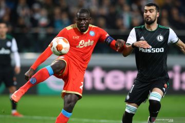 Pesepak bola Napoli Kalidou Koulibaly (kiri) berupaya melewati pemain belakang Legia Warsawa dalam laga Group C Liga Europa, di Stadion Wojska Polskiego, Warsawa, Polandia, Kamis (4/11/2021). Napoli berhasil megalahakanLegia Warsawa 4-1. ANTARA FOTO/Reuters-Kacper Pempel/hp.