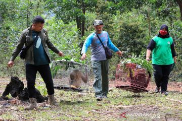 Petugas Balai Konservasi Sumber Daya Alam (BKSDA) Aceh membawa satwa langka dan dilindungi jenis Owa Siamang (Symphalangus Syndactylus) dan Owa Lar (Hylobates lar) yang diserahkan warga untuk dilepasliarkan di kawasan hutan Kabupaten Aceh Besar, Aceh, Sabtu (6/11/2021). BKSDA Aceh melepasliarkan dua ekor satwa langka dan dilindungi jenis Owa Lar dan Owa Siamang (Symphalangus Syndactylus) yang diserahkan warga untuk dikembalikan ke habitatnya setelah mendapat perawatan dan rehabilitasi oleh lembaga konservasi itu. ANTARA FOTO / Irwansyah Putra/aww.