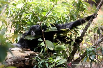 Satwa langka dan dilindungi jenis Owa Siamang (Symphalangus Syndactylus) yang baru dilepasliarkan Balai Konservasi Sumber Daya Alam (BKSDA) berada di atas pohon di kawasan hutan Kabupaten Aceh Besar, Aceh, Sabtu (6/11/2021). BKSDA Aceh melepasliarkan dua ekor satwa langka dan dilindungi jenis Owa Lar dan Owa Siamang (Symphalangus Syndactylus) yang diserahkan warga untuk dikembalikan ke habitatnya setelah mendapat perawatan dan rehabilitasi oleh lembaga konservasi itu. ANTARA FOTO / Irwansyah Putra/aww.