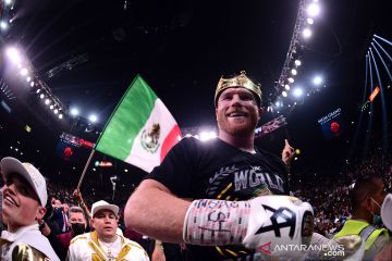 Petinju Meksiko Canelo Alvarez merayakan kemenangan atas petinju Amerika Serikat Caleb Plant pada pertandingan kelas menengah super di MGM Grand Garden Arena, Las Vegas, Nevada, Minggu (7/11/2021). Canelo Alvarez menang TKO pada ronde 11 dan berhasil mempertahankan sabuk WBA (Super), WBC, WBO, dan The Ring yang disandangnya. Kemenangan itu juga membuatnya merebut sabuk IBF yang semula dimiliki Plant. Ia menjadi juara sejati (undisputed) kelas menengah super yang pertama sejak era empat sabuk juara dimulai. ANTARA FOTO/REUTERS/USA TODAY Sports/Joe Camporeale/pras.