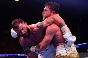 Petinju Meksiko Canelo Alvarez (kiri) bertarung melawan petinju Amerika Serikat Caleb Plant pada pertandingan kelas menengah super di MGM Grand Garden Arena, Las Vegas, Nevada, Minggu (7/11/2021). Canelo Alvarez menang TKO pada ronde 11 dan berhasil mempertahankan sabuk WBA (Super), WBC, WBO, dan The Ring yang disandangnya. Kemenangan itu juga membuatnya merebut sabuk IBF yang semula dimiliki Plant. Ia menjadi juara sejati (undisputed) kelas menengah super yang pertama sejak era empat sabuk juara dimulai. ANTARA FOTO/REUTERS/USA TODAY Sports/Joe Camporeale/pras.