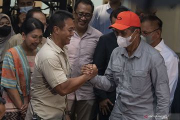 Kepala Staf TNI Angkatan Darat (KSAD) sekaligus calon Panglima TNI Jenderal Andika Perkasa (kiri) didampingi keluarganya menyambut kedatangan anggota Komisi I DPR sekaligus Wakil Ketua DPR Lodewijk F. Paulus (kedua kanan) dalam verifikasi faktual di kediaman Andika di Senayan, Jakarta, Minggu (7/11/2021). Verifikasi faktual oleh DPR ini merupakan bagian dari rangkaian ujian yang harus dilalui Jenderal Andika Perkasa sebagai calon Panglima TNI. ANTARA FOTO/Aditya Pradana Putra/hp.