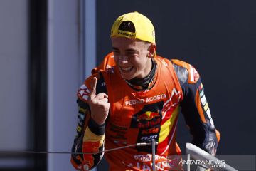 Pembalap Red Bull KTM Ajo Pedro Acosta merayakan kemenangan di podium sekaligus memastikan gelar juara Moto3 2021 usai balapan di GP Algarve di Portimao, Portugal, (7/11/2021). ANTARA FOTO/REUTERS/Marcelo Del Pozo/aww.