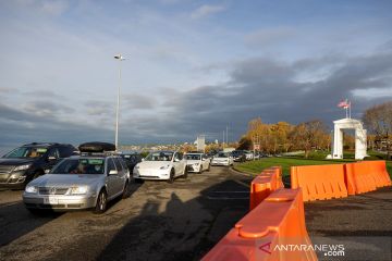 Sejumlah pelaku perjalanan dengan kendaraan melintas masuk ke wilayah Amerika Serikat dari Kanada di gerbang perbatasan Peace Arch, Blaine, Washington, Amerika Serikat, Senin (8/11/2021). Amerika Serikat mengizinkan masuk warga negara asing dari 26 negara yang sudah divaksinasi COVID-19 secara penuh via jalur udara maupun darat mulai 8 November 2021. ANTARA FOTO/REUTERS/Jason Redmond/wsj.