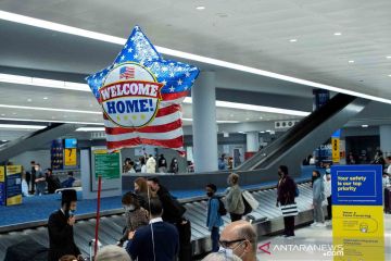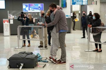 Seorang penumpang pesawat udara tiba dan bertemu dengan keluarganya di terminal kedatangan internasional Bandara Dulles, Chantilly, Virginia, Amerika Serikat, Senin (8/11/2021). Amerika Serikat mengizinkan masuk warga negara asing dari 26 negara yang sudah divaksinasi COVID-19 secara penuh via jalur udara maupun darat mulai 8 November 2021. ANTARA FOTO/REUTERS/Kevin Lamarque/wsj.