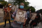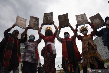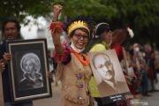 Sejumlah seniman membawa poster wajah tokoh-tokoh nasional pada acara karnaval seni budaya di depan gedung Taman Ismail Marzuki, Cikini, Jakarta, Rabu (10/11/2021). Karnaval tersebut dilaksanakan dalam rangka memperingati HUT ke-53 Pusat Kesenian Taman Ismail Marzuki sekaligus merayakan dianugerahkannya gelar pahlawan nasional kepada tokoh perfilman nasional Usmar Ismail oleh Presiden Joko Widodo. ANTARA FOTO/Indrianto Eko Suwarso/wsj.
