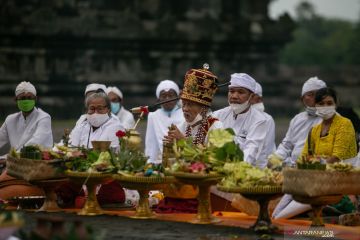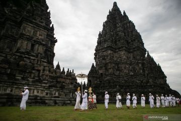 Umat Hindu mengikuti prosesi upacara Abhiseka di pelataran Candi Prambanan, Sleman, DI Yogyakarta, Jumat (12/11/2021). Upacara Abhiseka merupakan prosesi penyucian dan peringatan diresmikannya Candi Prambanan pertama kali oleh Rakai Pikatan pada tahun 856 Masehi sebagai penanda puncak kekuasaan kerajaan Mataram Kuno. ANTARA FOTO/Hendra Nurdiyansyah/hp.