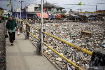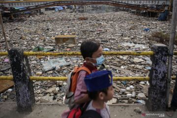 Warga berjalan di samping sampah yang menumpuk di Kali Dadap yang dipenuhi sampah di Kosambi, Kabupaten Tangerang, Banten, Jumat (12/11/2021). Kali tersebut dipenuhi oleh sampah sehingga menimbulkan bau tak sedap dan berpotensi menyimbulkan penyakit bagi warga sekitarnya. ANTARA FOTO/Fauzan/hp.