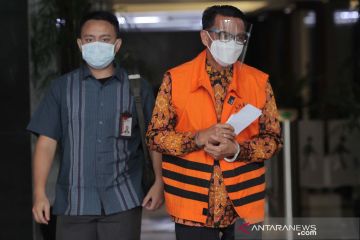 Terdakwa Gubernur nonaktif Sulawesi Selatan Nurdin Abdullah (kanan) berjalan menuju mobil tahanan usai menjalani sidang Tuntutan secara virtual di Gedung Merah Putih KPK, Jakarta, Senin (15/11/2021). Nurdin Abdullah dituntut 6 tahun penjara ditambah denda Rp500 juta subsider 6 bulan kurungan karena dinilai terbukti menerima suap sebesar Rp13,812 miliar terkait dugaan suap dan gratifikasi. ANTARA FOTO/Reno Esnir/aww.