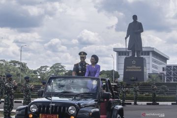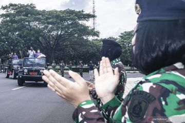 Panglima TNI Jenderal TNI Andika Perkasa bersama Istri Diah Erwiany mengikuti tradisi pisah sambut Panglima TNI di Mabes TNI, Cilangkap, Jakarta, Kamis (18/11/2021). Panglima TNI Jenderal TNI Andika Perkasa menyatakan bahwa dirinya akan melanjutkan program-program yang sebelumnya telah dicetuskan oleh Marsekal TNI Hadi Tjahjanto. ANTARA FOTO/Muhammad Adimaja/hp.
