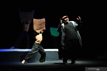 Pelakon Teater Potlot mementaskan naskah “KU-TUK” karya Conie Sema di Gedung Teater Taman Budaya Jambi, Jambi, Jumat (19/11/2021) malam. “KU-TUK” bercerita tentang komitmen “ekosentris” Talang Tuwo dan nilai-nilai peradaban dalam perjalanan rempah dari masa Sriwijaya hingga hari ini. ANTARA FOTO/Wahdi Septiawan/wsj.