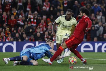 Pesepak bola Liverpool Mohamed Salah melakukan selebrasi setelah mencetak gol ke gawang Arsenal yang di jaga penjaga gawang Aaron Ramsdale (kiri) dalam laga pekan kedua belas Liga Inggris, di Stadion Anfield, Liverpool, Inggris, Sabtu (20/11/2021). Liverpool sikat Arsenal 4-0. ANTARA FOTO/Reuters-Phil Noble/hp.