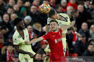 Pesepak bola Liverpool Diogo Jota (tengah) berebut bola dengan pesepak bola Arsenal Thomas Partey dan Ben White Action dalam laga pekan kedua belas Liga Inggris, di Stadion Anfield, Liverpool, Inggris, Sabtu (20/11/2021). Liverpool sikat Arsenal 4-0. ANTARA FOTO/Reuters-Phil Noble/hp.