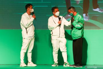 Artis Raffi Ahmad (kiri) bersama President Grab Indonesia Ridzki Kramadibrata (tengah), berbincang dengan mitra pengemudi Grab saat peluncuran Hari Mitra Grab di JCC, Jakarta, Rabu (24/11/2021). Hari Mitra Grab dirancang sebagai perhelatan khusus untuk menunjukkan apresiasi Grab atas dedikasi para mitra pengemudi dan mitra merchant yang setia melayani konsumen Indonesia. ANTARA FOTO/Rivan Awal Lingga/hp.