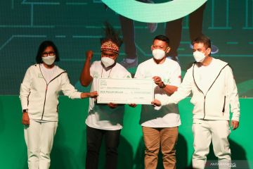 Country Managing Director of Grab Indonesia Neneng Goenadi (kiri) bersama President Grab Indonesia Ridzki Kramadibrata (kanan) menyerahkan donasi kepada mitra Grab saat peluncuran Hari Mitra Grab di JCC, Jakarta, Rabu (24/11/2021). Hari Mitra Grab dirancang sebagai perhelatan khusus untuk menunjukkan apresiasi Grab atas dedikasi para mitra pengemudi dan mitra merchant yang setia melayani konsumen Indonesia. ANTARA FOTO/Rivan Awal Lingga/hp.