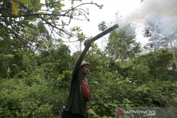 Petugas Conservation Response Unit (CRU) DAS Peusangan Balai Konservasi Sumber Daya Alam (BKSDA) Aceh membakar mercon saat berpatroli, memantau dan mengusir kawanan gajah sumatera (Elephas maximus sumatranus) liar yang berkeliaran di permukiman dan perkebunan warga Desa Negeri Antara, Kecamatan Pintu Rime, Bener Meriah, Aceh, Kamis (25/11/2021). Petugas Conservation Response Unit (CRU) DAS Peusangan Balai Konservasi Sumber Daya Alam (BKSDA) Aceh memperkirakan sebanyak 20 ekor lebih gajah sumatera liar yang terbagi dalam beberapa kelompok kembali berkeliaran dan mencari makan di perkebunan penduduk dalam beberapa hari terakhir. ANTARA FOTO/Irwansyah Putra/rwa.