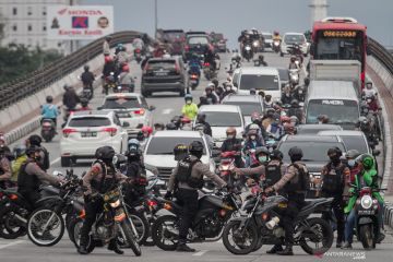 Polisi menyekat Flyover Purwosari untuk menghalau suporter yang mengawal tim Persis Solo menuju Stadion Manahan di Solo, Jawa Tengah, Senin (29/11/2021). Polisi membubarkan dan melakukan penyekatan untuk menghalau suporter yang nekat konvoi mengawal tim Persis Solo menjalani pertandingan terakhir grup C melawan PSCS Cilacap. ANTARA FOTO/Mohammad Ayudha/foc.