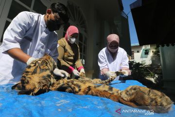 Dokter hewan Balai Konservasi Sumber Daya Alam (BKSDA) Aceh Taing Lubis (tengah) bersama mahasiswa Fakultas Kedokteran Hewan Universitas Syiah Kuala melakukan forensik terbatas terhadap barang bukti kulit harimau sumatera (Panthera tigris sumatrae) hasil sitaan di Banda Aceh, Aceh, Rabu (1/12/2021). Forensik terbatas tersebut dilakukan untuk mengetahui jenis kelamin, usia dan melihat perubahan pada kulit serta perkiraan penyebab kematian harimau yang berusia sekitar satu tahun itu. ANTARA FOTO / Irwansyah Putra/aww.
